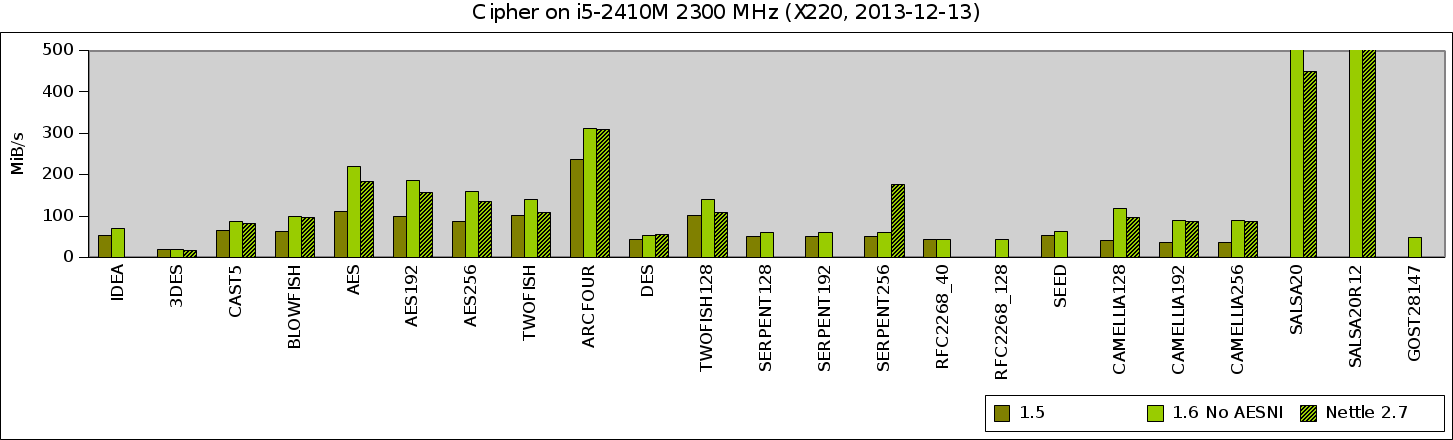 It is quite obvious that the throughput available with 1.6 is way better than with 1.5 and also considerable higher than with Nettle.